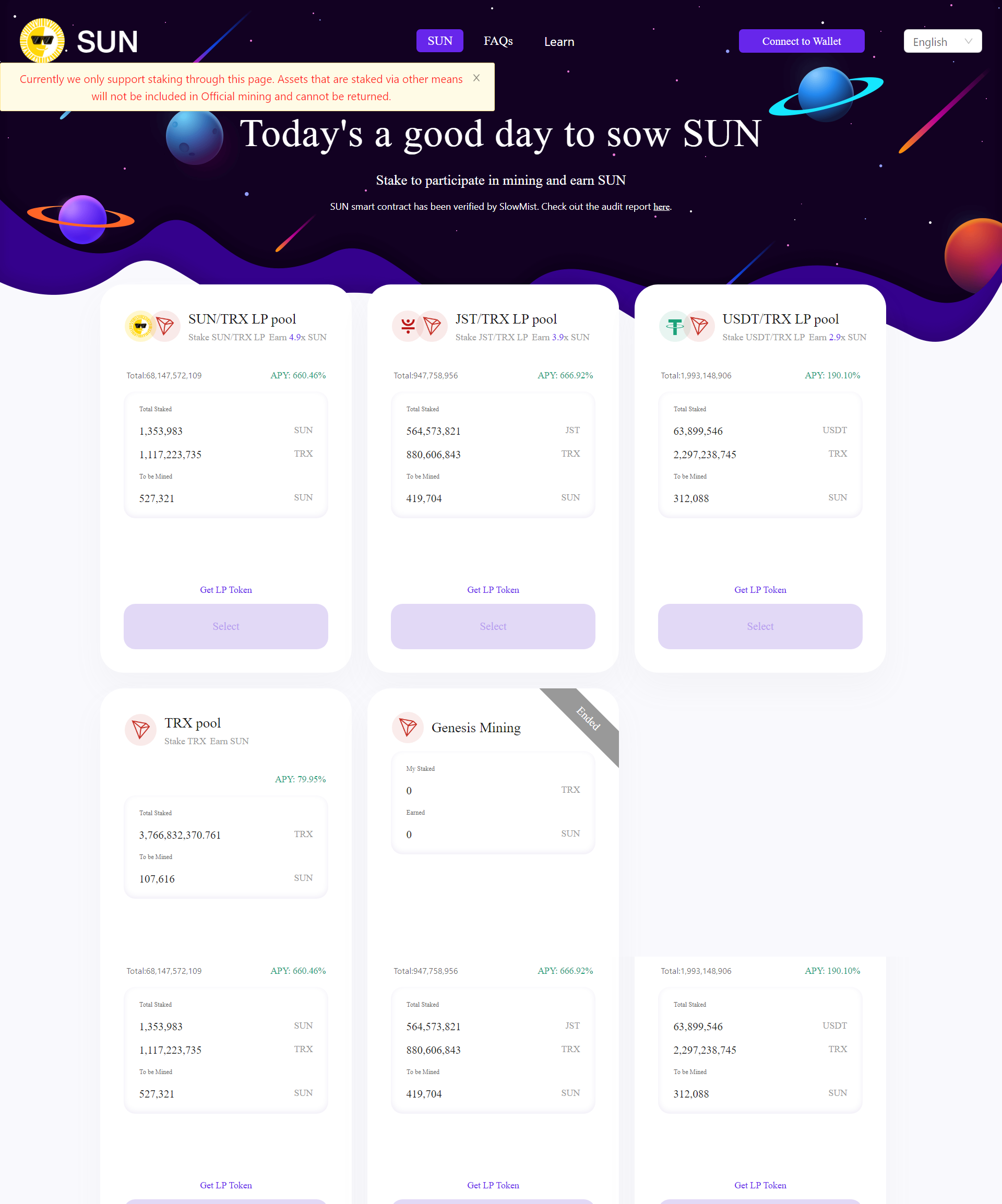 Na verdade, a mineração de gênese do SUN ofereceu recompensas incríveis no staking em tokens de liquidez, embora tenha vida curta. No entanto, rodadas subsequentes de farming de rendimento com rendimentos cada vez menores seguiram no Sun.io , o local de staking do token da Sun.
