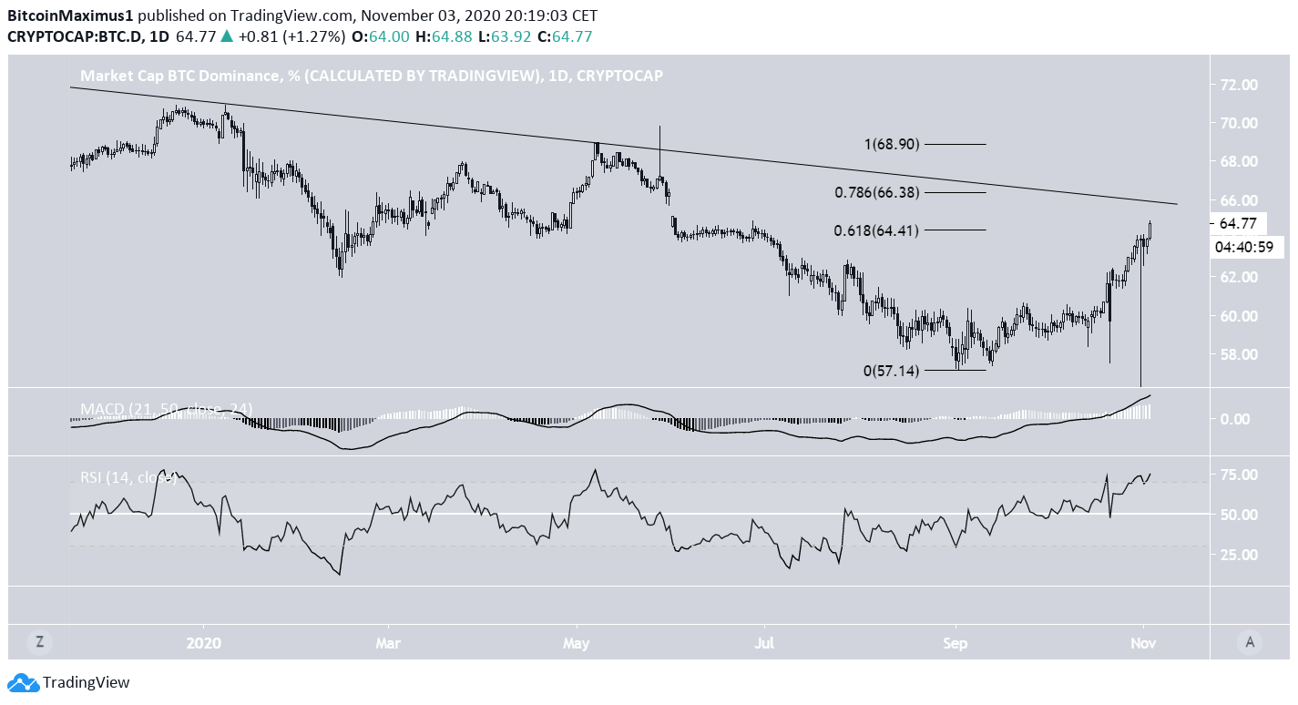 A taxa de dominância do Bitcoin (BTCD) também tem aumentado significativamente desde o início de setembro. No entanto, a taxa está se aproximando de uma área de resistência importante e uma linha de resistência descendente que está em vigor desde setembro de 2019.