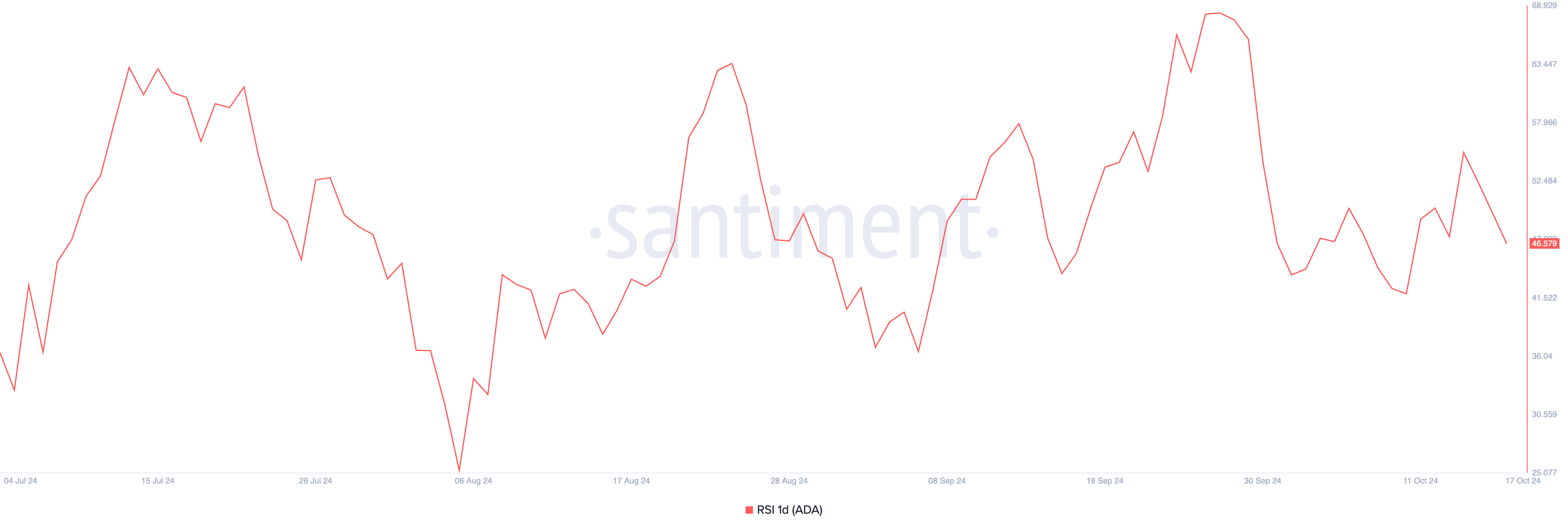 SponsoredO declínio do Índice de Força Relativa (RSI) da Cardano apoia essa perspectiva baixista. Atualmente, este indicador está em tendência de queda e abaixo da linha neutra de 50, em 48,57. Este valor de RSI indica que a pressão de compra está diminuindo no mercado do Cardano, e os vendedores estão se tornando mais dominantes.