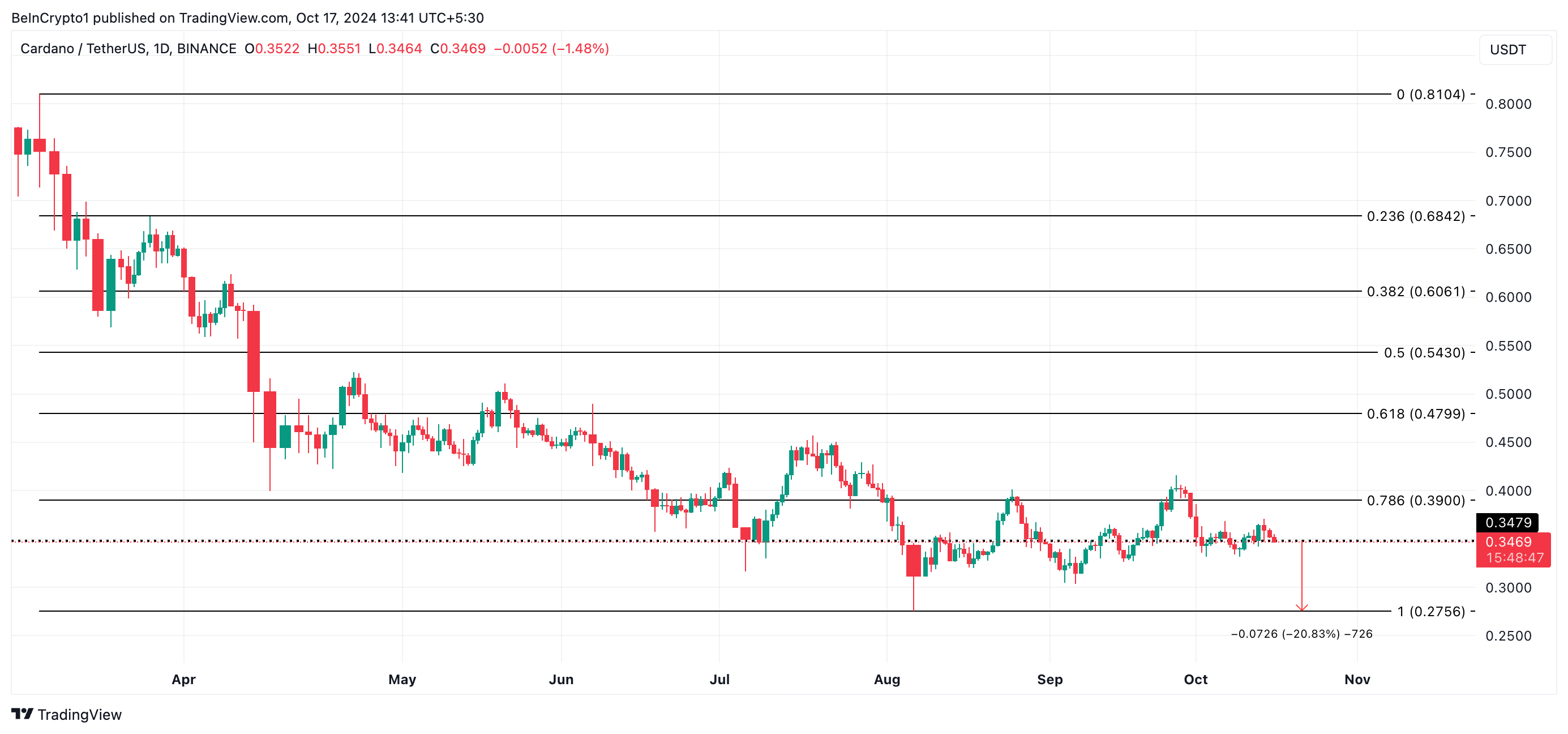 Atualmente, a Cardano está negociada a US$ 0,3469 e está testando o nível de suporte em US$ 0,3479. Assim, um aumento na pressão de venda pode levar a um rompimento abaixo deste suporte, potencialmente causando uma queda de 21% no preço para US$ 0,27.