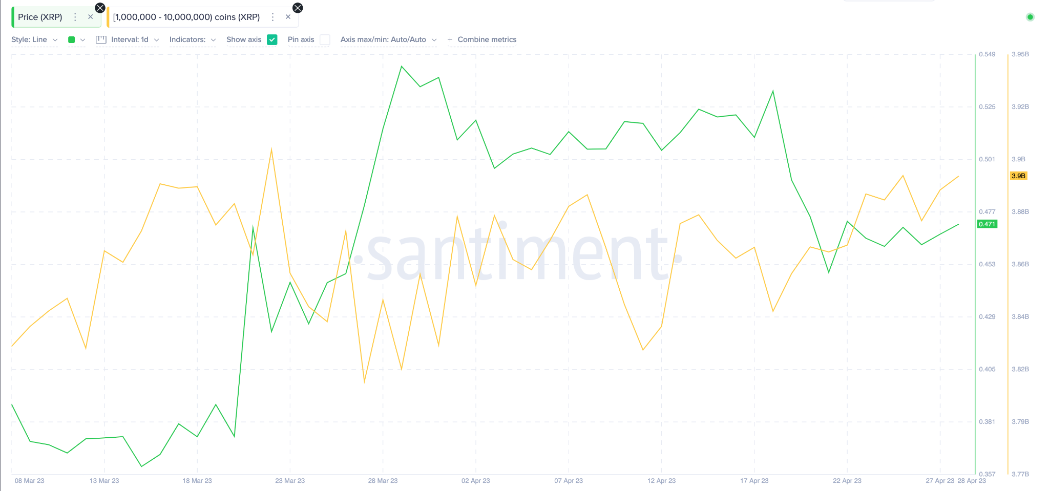 O gráfico Santiment abaixo mostra como o grupo de baleias com um milhão a dez milhões de unidades de moedas XRP está comprando desde a semana passada. A linha amarela mostra que as baleias intensificaram o acúmulo por volta de 18 de abril. Desde então, elas adicionaram 50 milhões de moedas no valor de quase US$ 23,5 milhões a um valor de mercado atual de US$ 0,47.