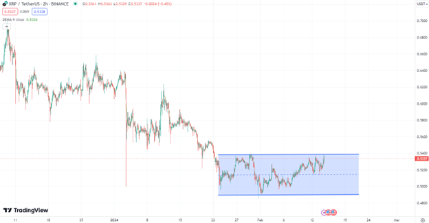 A XRP está atualmente sendo negociado em torno de US$ 0,53, no limite superior do canal de negociação lateral em que tem sido mantido nas últimas semanas.
