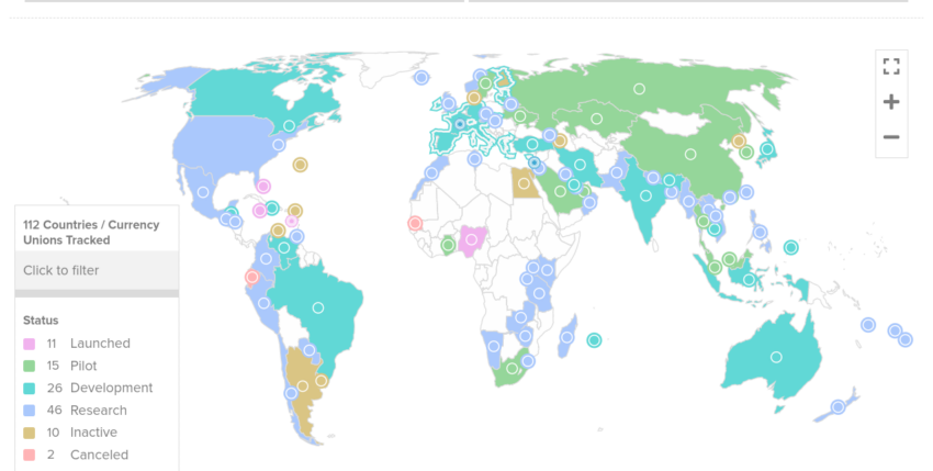 Em maio de 2020, apenas 35 países consideravam uma moeda digital do banco central, disse. Pelo menos 50 países estão em fase avançada de exploração, o que significa desenvolvimento, piloto ou lançamento. Cerca de uma dúzia de estados e países já lançaram totalmente uma moeda digital.