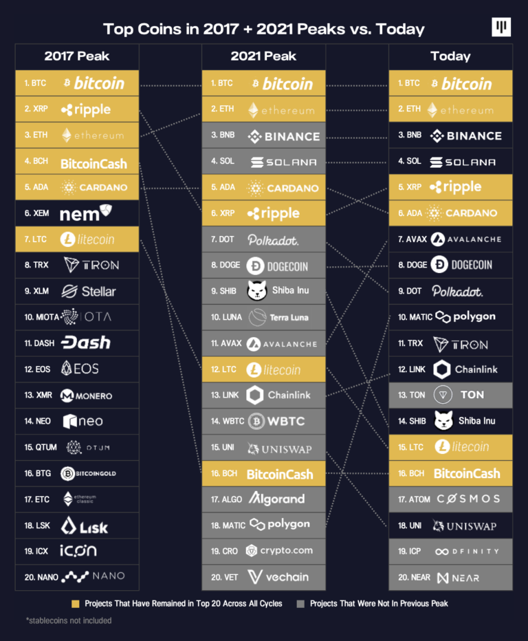 A Pantera Capital afirma que as principais criptomoedas estão apresentando estabilidade no ciclo atual. Isto é o oposto da queda observada em 2017. Os tokens que saíram do top 20 foram então substituídos por novas criptomoedas. No momento, estamos vendo apenas pequenas alterações nas classificações.
