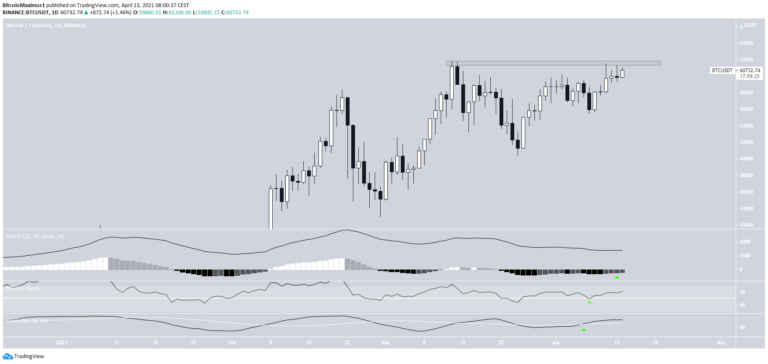 Em 10 de abril, o Bitcoin fez uma tentativa de atingir um novo máximo histórico, mas foi interrompido pela área de resistência de US$ 61.600. Isso criou um longo pavio superior. Ele fez uma tentativa semelhante em 12 de abril, mas foi interrompido mais uma vez.