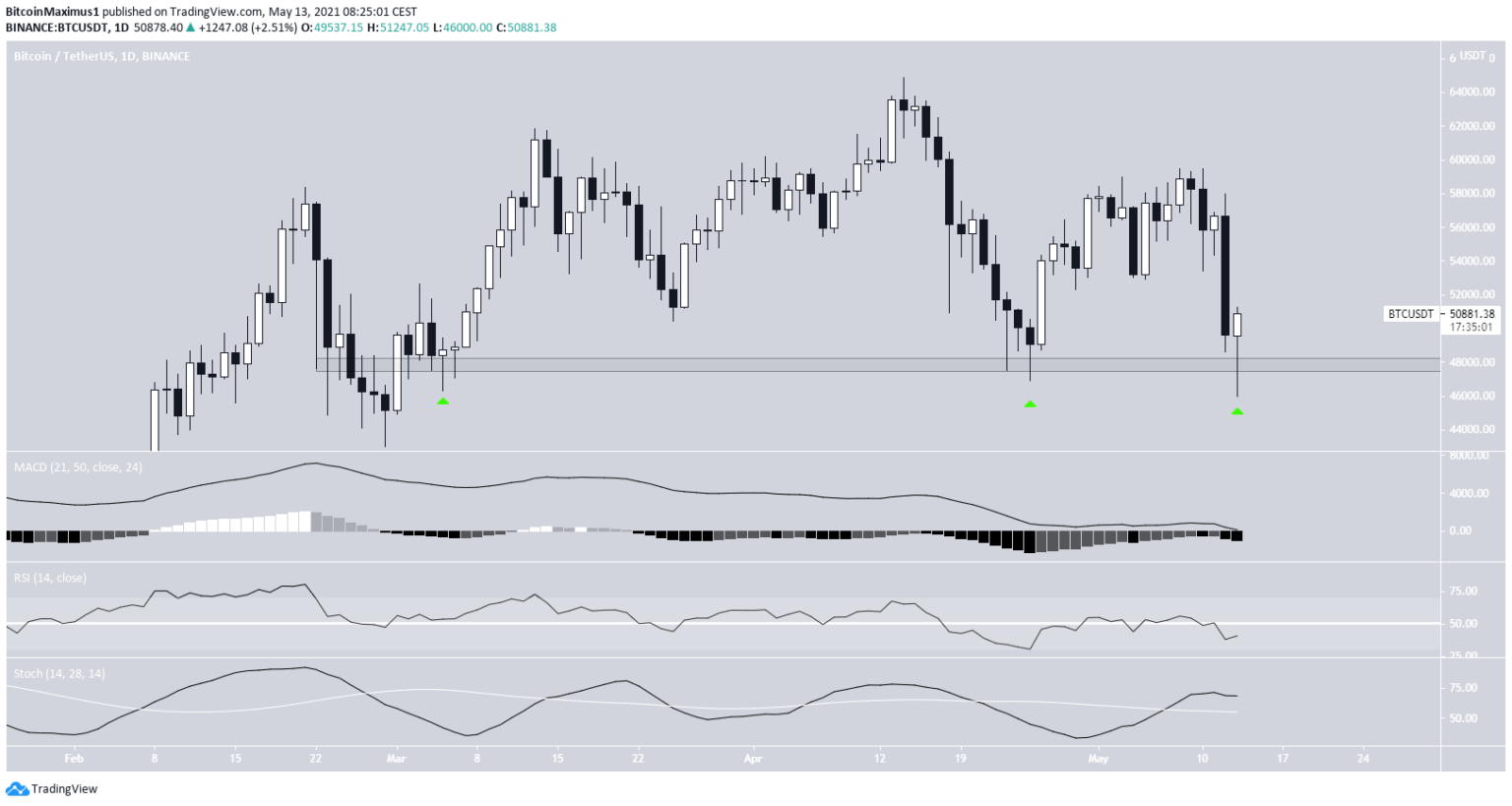A queda continuou nas primeiras horas da manhã até que uma mínima de US$ 46.000 foi alcançada. O suporte de US$ 48.000 estava intacto desde o início de março de 2021. No entanto, o BTC se recuperou para uma alta de US$ 51.247 e está em processo de criação de um candle de martelo de alta.