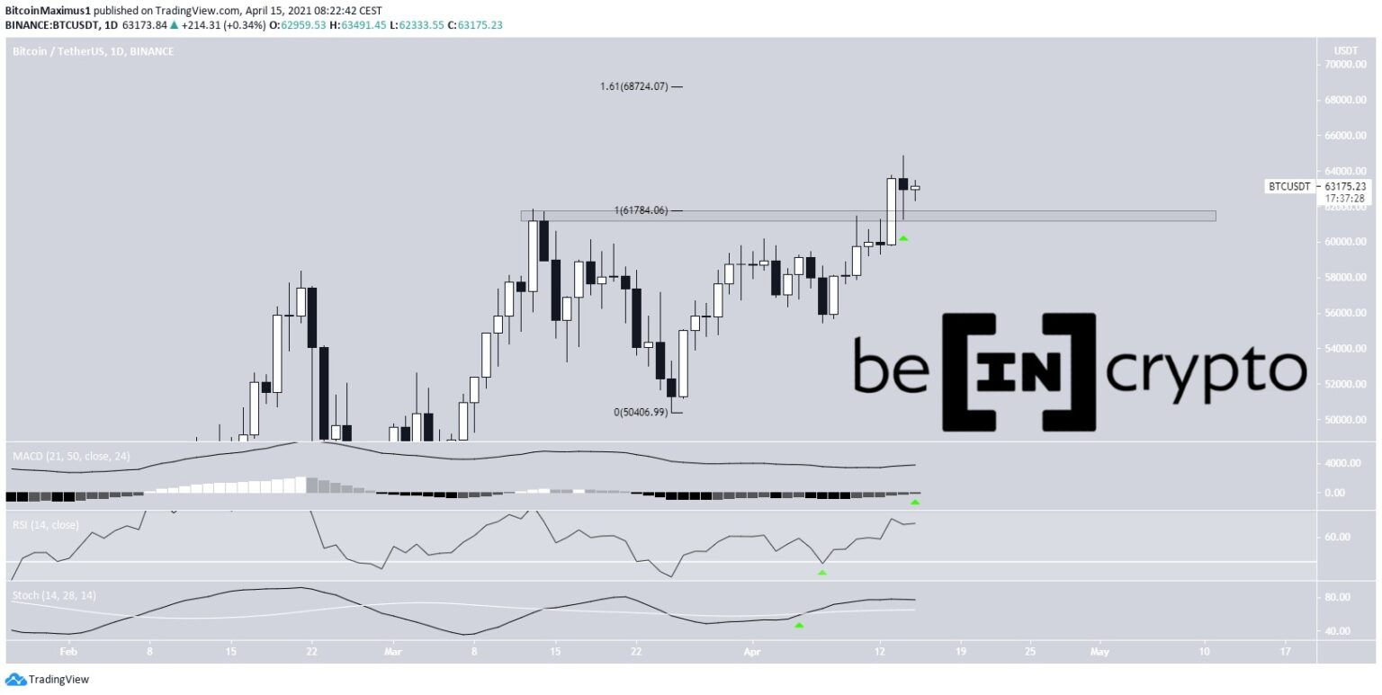 Depois de sair da área de resistência de US$ 61.500 na terça-feira (13), o BTC atingiu um novo preço máximo de US$ 64.854 na noite de quarta-feira (14).