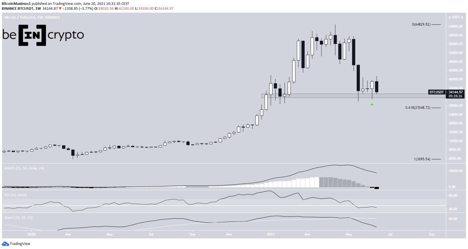 O gráfico BTC semanal fornece uma perspectiva negativa. O Bitcoin parecia ter começado um movimento de alta há duas semanas, após criar um candle de martelo de alta com um pavio inferior longo. O salto ocorreu bem na área de suporte horizontal de longo prazo de US$ 32.500 (ícone verde).