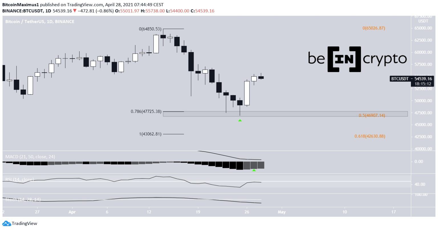 A área é criada pelo nível 0,5 de Fibonacci de longo prazo (laranja) e o nível 0,786 de Fibonacci de curto prazo (preto). Até agora, o BTC atingiu um máximo local de US$ 55.738.