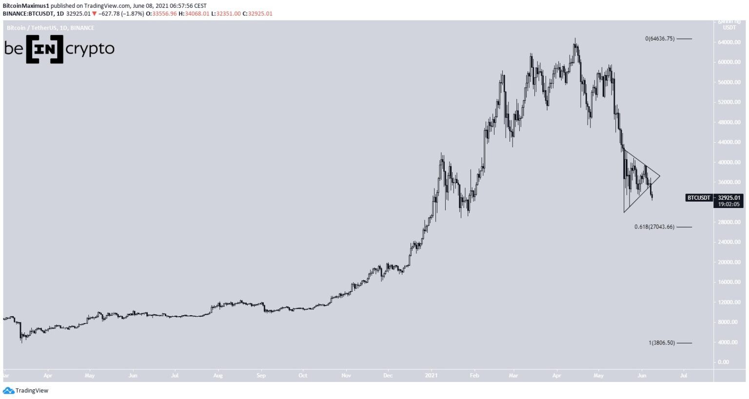 SponsoredO BTC vinha sendo negociado dentro de um triângulo simétrico desde 19 de maio. Depois de se consolidar por quase um mês, finalmente rompeu o padrão na última segunda-feira (7). Até agora, o BTC atingiu um mínimo de US$ 32.351. A área de suporte mais próxima está perto de US$ 27.000, criada pelo nível de suporte de retração de Fibonacci de 0,618.