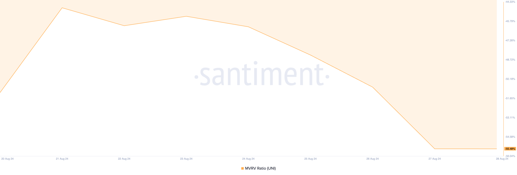 No último mês, o valor do token nativo da Uniswap caiu 27%, com a altcoin negociada atualmente a US$ 5,71. Apesar dessa queda, a redução apresenta uma potencial oportunidade de compra, como indicado por seu índice de valor de mercado para valor realizado (MVRV) negativo.