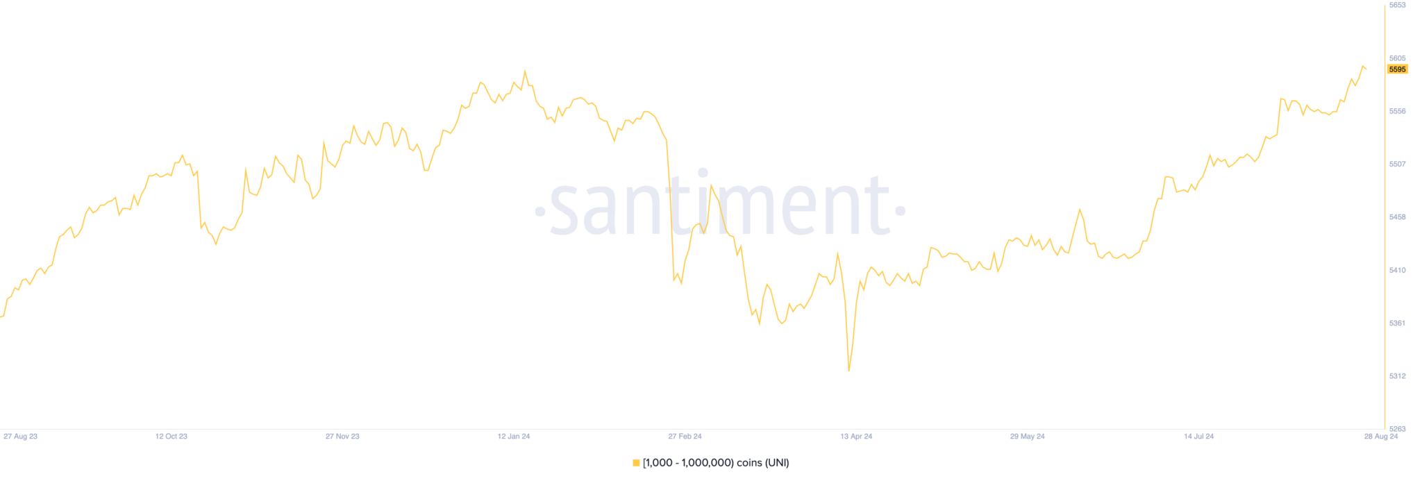 Dados da Santiment revelam que o número de baleias UNI que possuem entre 1.000 e 1 milhão de tokens aumentou 1% no último mês. Atualmente, esse grupo consiste em 5.595 endereços, marcando seu maior número desde 10 de janeiro.