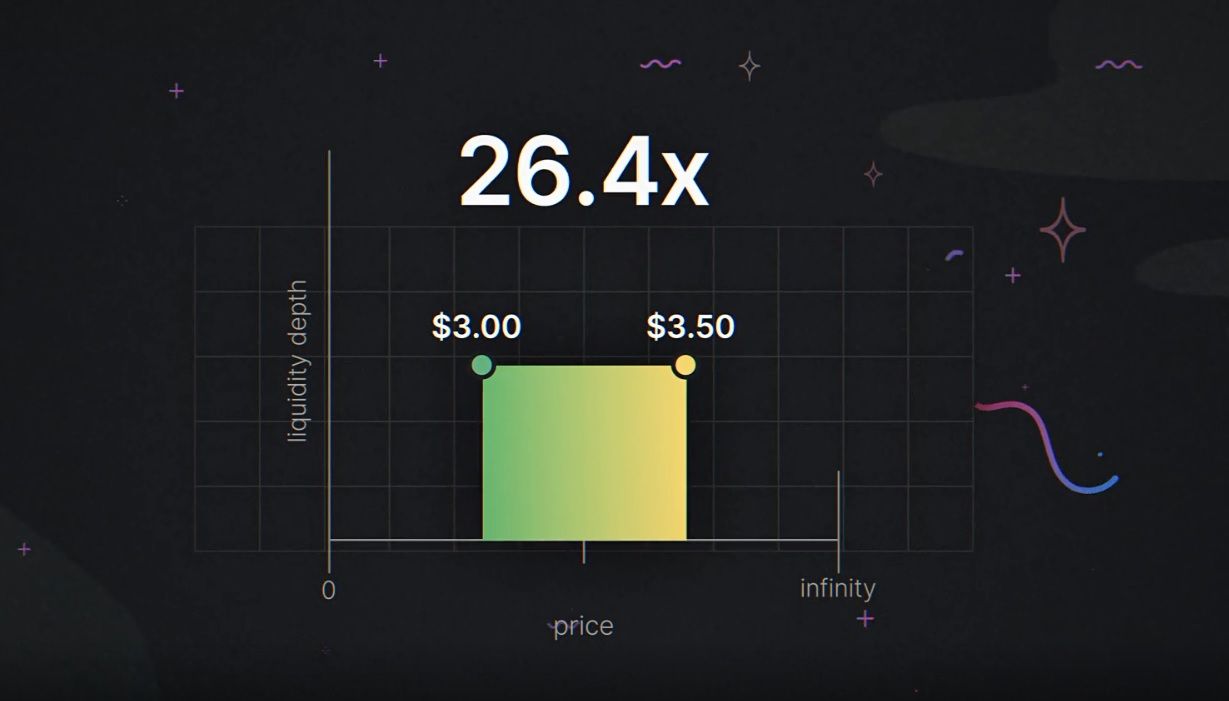 Um exemplo disso é o fato os LPs poderem ter um emparelhamento ETH/USDT em um único pool de liquidez, definindo seu uso de liquidez apenas entre US$ 2.000 – US$ 2.700. Pelo mesmo par de tokens, uma faixa de preço diferente pode ser definida para o mesmo pool. Se o preço do ETH estiver fora da faixa designada, o LP não receberá nenhuma taxa.