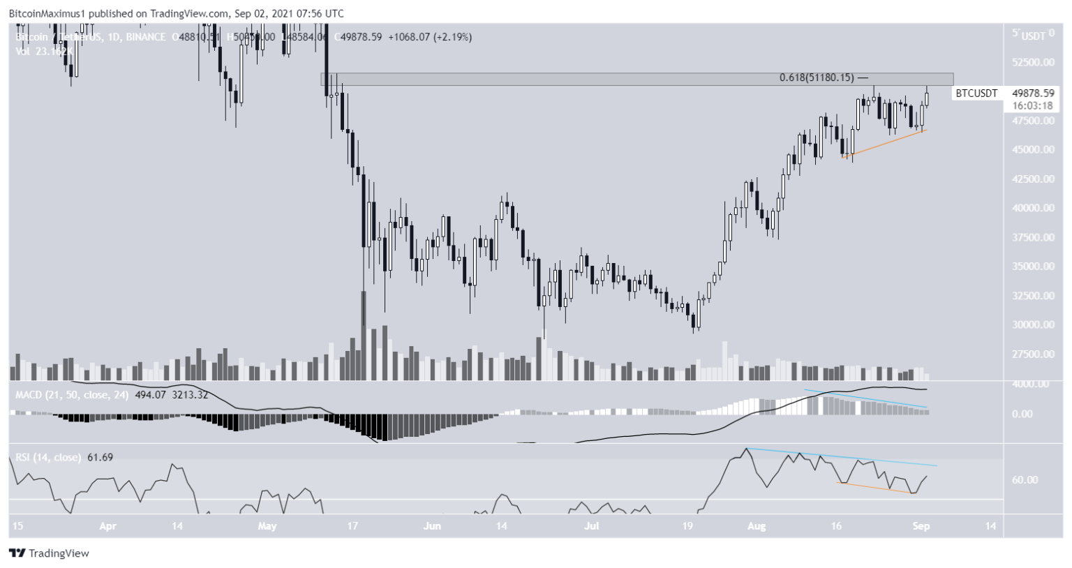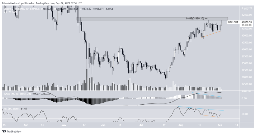 Apesar do rompimento de curto prazo, o BTC ainda está sendo negociado abaixo da área de uma resistência crucial em US$ 51.200. Esta é uma área de resistência horizontal e o nível de resistência de 0,618 da retração Fibonacci.