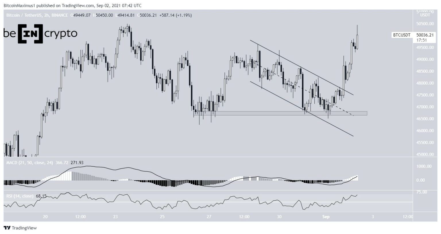 Após varrer as mínimas ontem, o BTC disparou na sequência. Até o momento, ele atingiu uma máxima de US$ 50.450. Tanto o MACD quanto o RSI estão em terreno otimista, apontando para a validade do rompimento.
