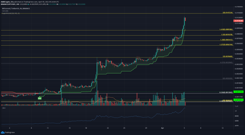 Neste momento de alta do BTT, os analistas estão fazendo interpretações diferentes sobre a atual fase da criptomoeda. De acordo com Valdrin Tahiri, experiente analista do BeInCrypto, o aumento de 900% que o BTT registrou em 23 dias não pode ser sustentado. Afirmando que o movimento ascendente do BTT se tornou acentuado, Tahiri acredita que, embora ainda não haja fraqueza, a alta não tende a continuar.