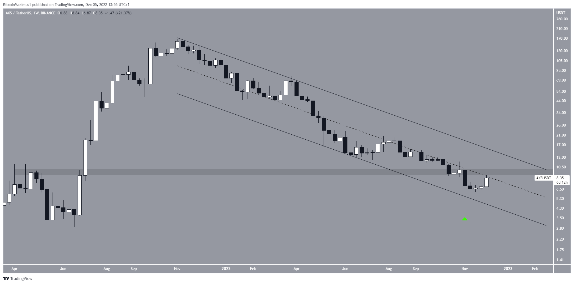 O AXS é o token nativo do Axie Infinity, um jogo blockchain play-to-ganhar desenvolvido pela Sky Mavis. O token AXS é usado para criar itens e pode ser trocado para comprar itens do jogo. O preço do AXS caiu dentro de um canal paralelo descendente de longo prazo desde que atingiu a máxima histórica de US$ 166,09 em novembro de 2021.