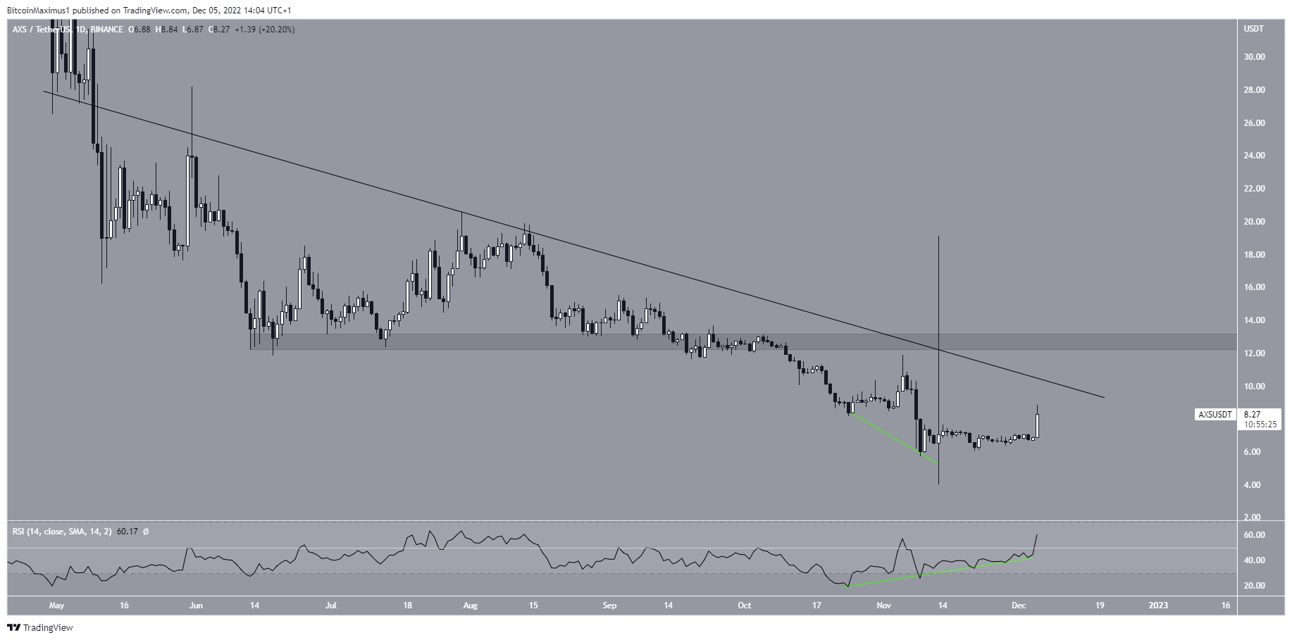 O gráfico diário mostra que o preço do AXS segue uma linha de resistência descendente desde o início de maio. Mais recentemente, a linha causou uma rejeição em 13 de novembro.