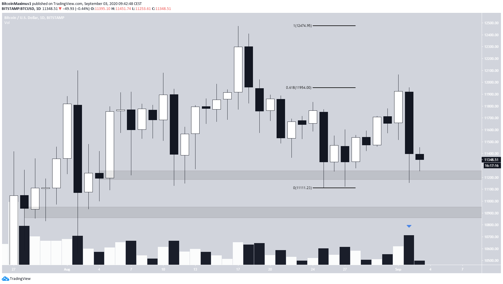 No dia 2 de setembro, o preço do Bitcoin (BTC) criou um candle de queda e caiu consideravelmente, caindo de volta para a área de suporte de $ 11.200.