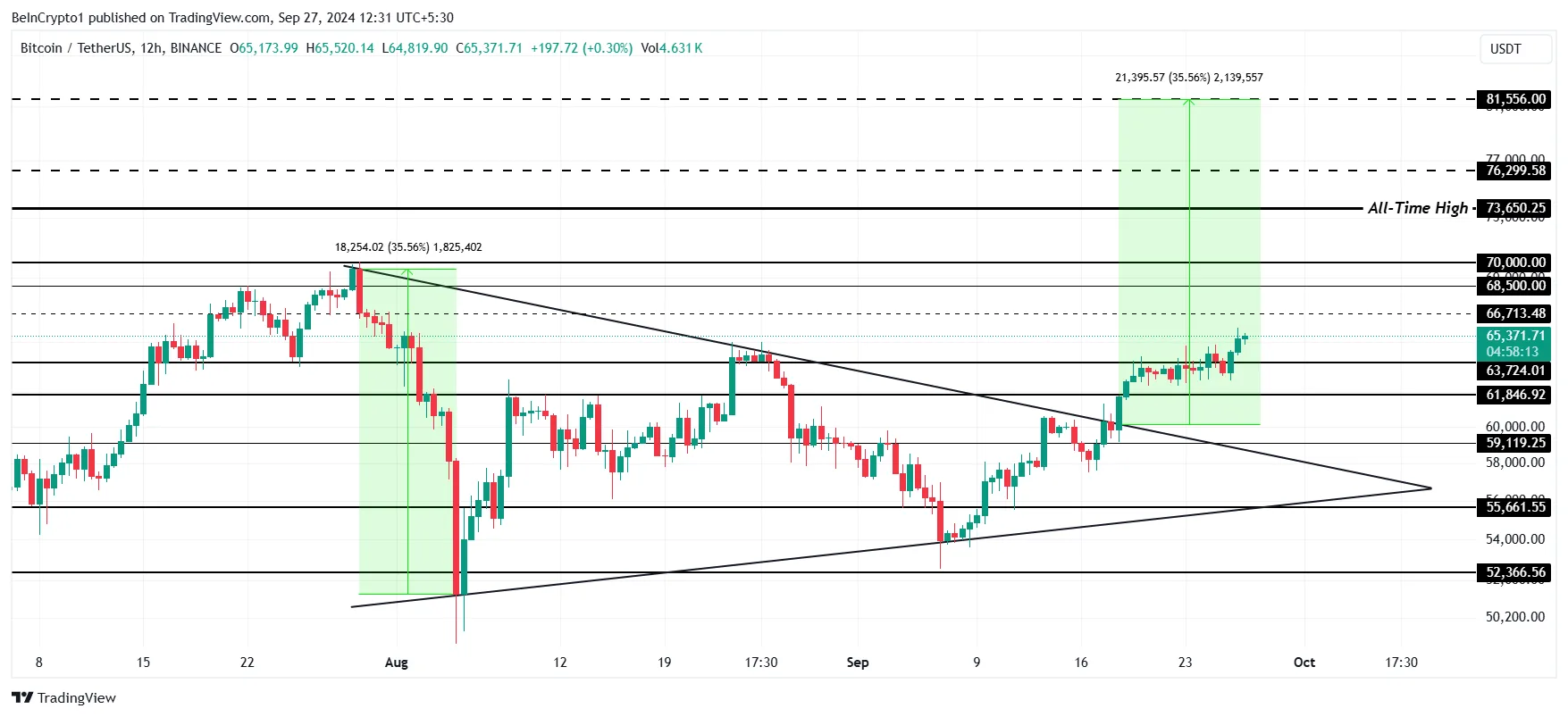 Nesse sentido, o ativo já saiu de um padrão de triângulo simétrico, sugerindo que a criptomoeda poderia subir até 35%, com um alvo potencial de US$ 81.556. No entanto, uma perspectiva mais realista coloca o próximo alvo em US$ 70 mil à medida que o BTC continua a ganhar força.