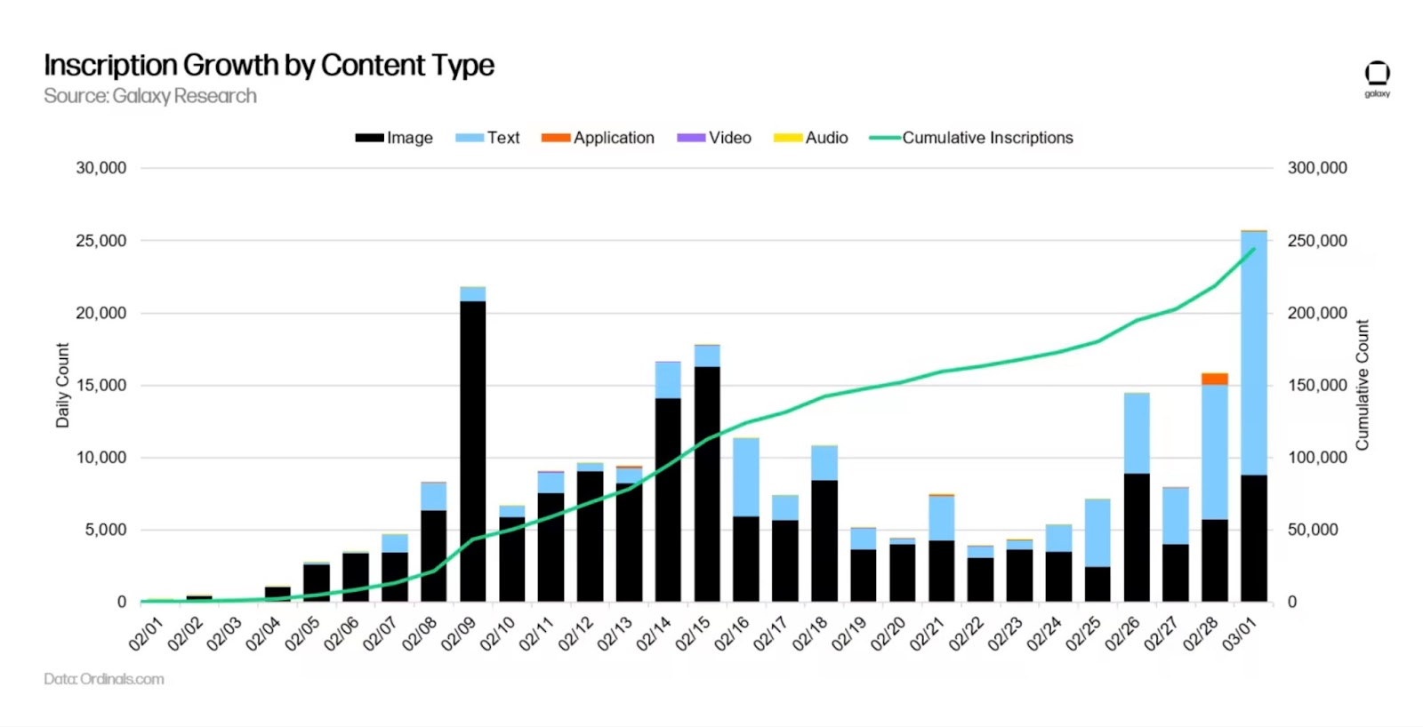 O sistema identifica o conteúdo por seu tipo MIME (se é uma imagem JPEG, um arquivo de áudio MP3, um vídeo ou código HTML, dentre outros) e uma rede de bytes (o conteúdo em si). Veja o crescimento de Inscriptions por Tipo de Conteúdo, na figura 1: