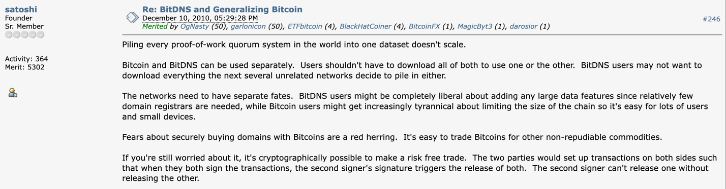 Dito de outro modo, a natureza descentralizada da tomada de decisões na comunidade Bitcoin muito provavelmente só é possível em virtude do desaparecimento de Satoshi Nakamoto.