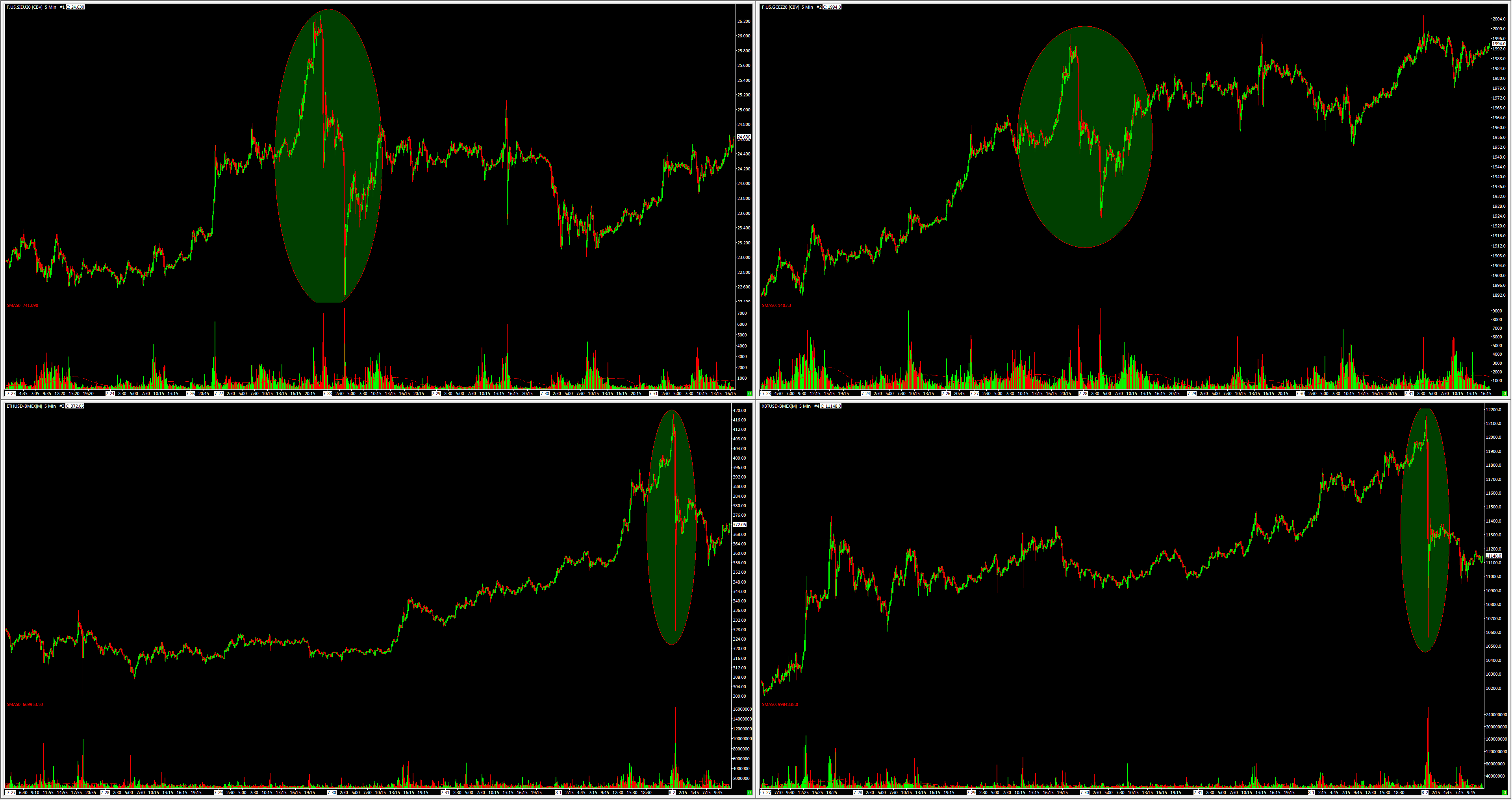 Ontem à noite foi um blow-off top de ETH e BTC. Um blow-off não precisa ser na máxima. A prata e o ouro tiveram um blow-off top na semana passada. Veja como os gráficos são semelhantes nos dias e minutos anteriores à queda. O cenário geral [para o Bitcoin] permanece inalterado. Máximas mais altas estão por vir em 2020, na minha opinião.
