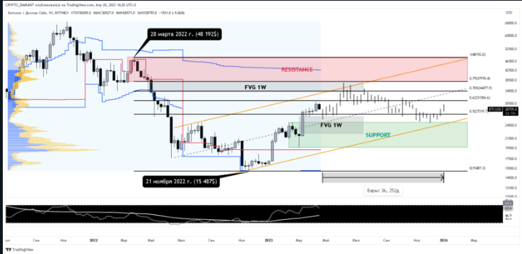 - No gráfico semanal do BTC, você pode ver que o preço do Bitcoin se move dentro do canal dinâmico institucional do volume horizontal (linha azul). Neste canal, você pode ver que o início da queda é o pico de 28 de março de 2022 (US$ 48.192) e o ponto culminante é a mínima de 21 de novembro de 2022 (US$ 15.487). Nesse intervalo, você pode esticar os níveis de retração de Fibonacci , que mostrarão a zona OTE, que serve como um intervalo de distribuição potencial para o ativo. O RSI está testando 70, indicando uma provável correção de crescimento.