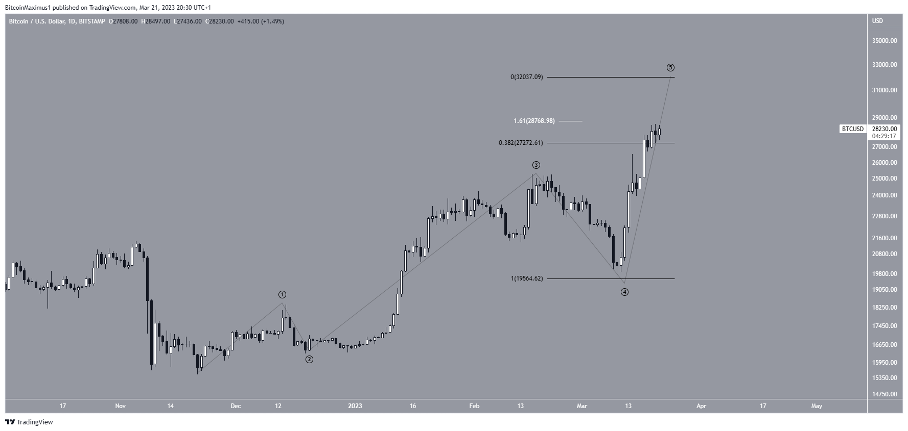 O gráfico diário do BTC mostra que o preço entrou em tendência de alta desde 10 de março, quando atingiu a mínima de US$ 19.569 (ícone verde). O movimento de alta desde então foi parabólico, levando a uma nova máxima anual de US$ 28.567. Essa alta foi feita exatamente no nível externo de 1,61 de Fibonacci da queda mais recente, que é um nível adequado para um topo.