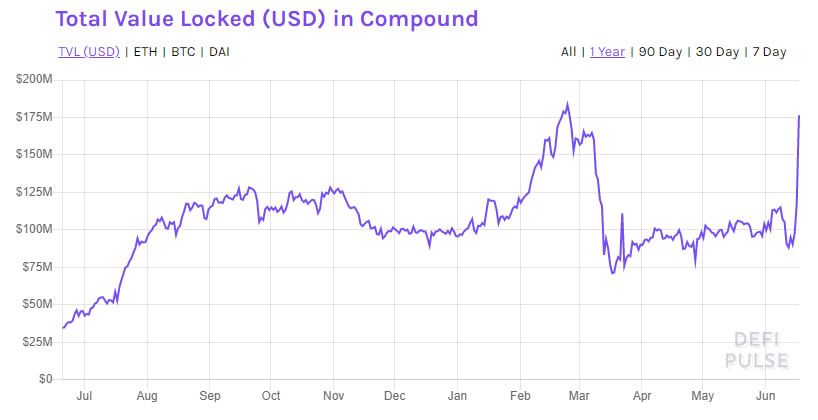 De acordo com o Defi Pulse , o Compound é o segundo maior protocolo DeFi com US $ 176 milhões em valor total trancado. Esse valor quase dobrou nesta semana, quando a distribuição de tokens começou. A maior alta histórica de todos os tempos em termos de valor total bloqueado foi no final de fevereiro, quando chegou a US $ 183 milhões, e está quase de volta a esse pico.