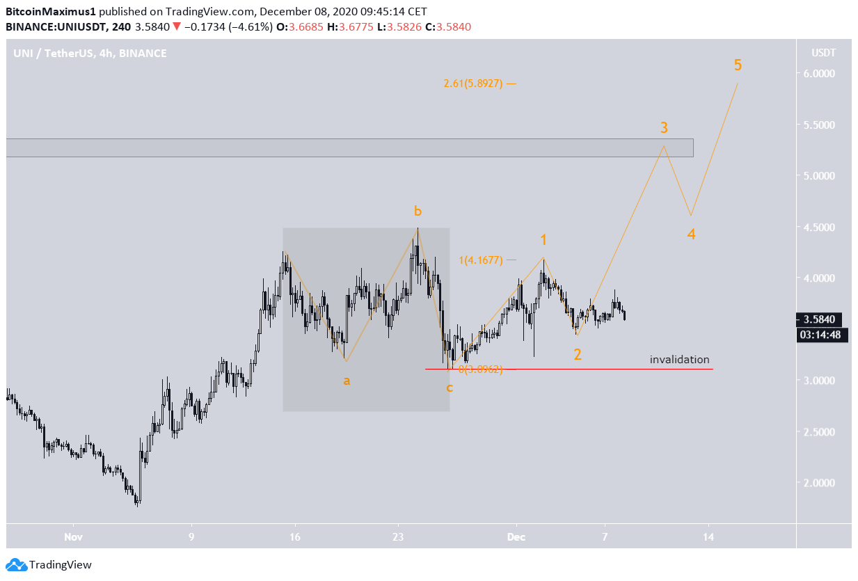 Se for verdade, a UNI pode já ter começado seu impulso de alta (mostrado em laranja abaixo) e concluído a onda 1 e possivelmente a onda 2.