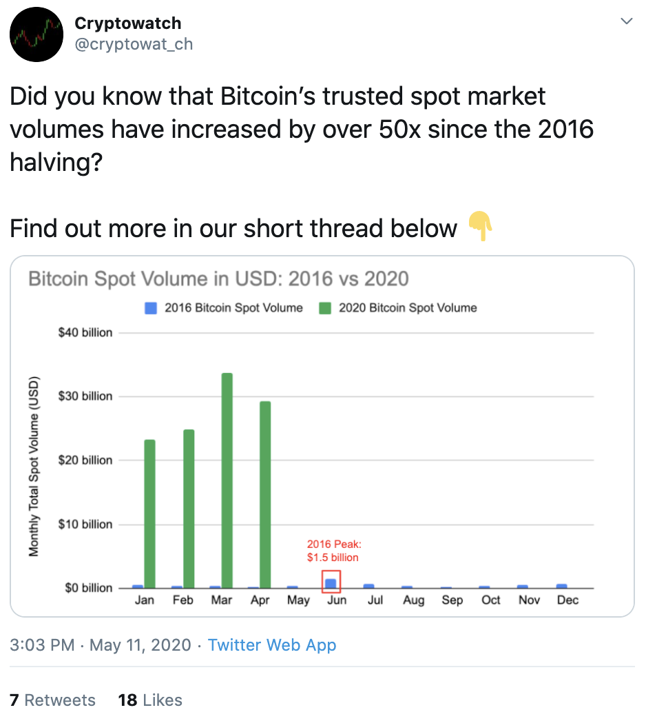 SponsoredComo a Cryptowatch (@cryptowat_ch) apontou no Twitter, o pico do volume de negociação em 2016 foi em junho, quando US $ 1,5 bilhão em volume mensal foi registrado. Para comparação, abril registrou quase US $ 30 bilhões. Em média, o volume de negociações spot de 2020 aumentou 50x desde 2016.