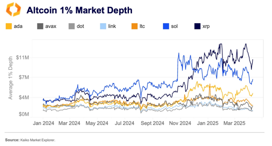 Atualmente, a profundidade de mercado do XRP supera a da SOL. Além disso, ela é o dobro da registrada pela ADA, o que posiciona o ativo entre os que têm maior capacidade de absorver ordens significativas sem provocar oscilações agressivas no preço.