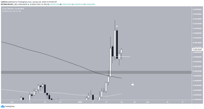 Em um período de 175 dias, de agosto de 2019 a janeiro de 2020, o preço do ZEC consolidou-se entre ₿0.0051 e ₿0.0038 satoshis. O preço estourou com um volume considerável em 14 de janeiro e atingiu uma alta de ± ₿0.0073, antes de diminuir um pouco.