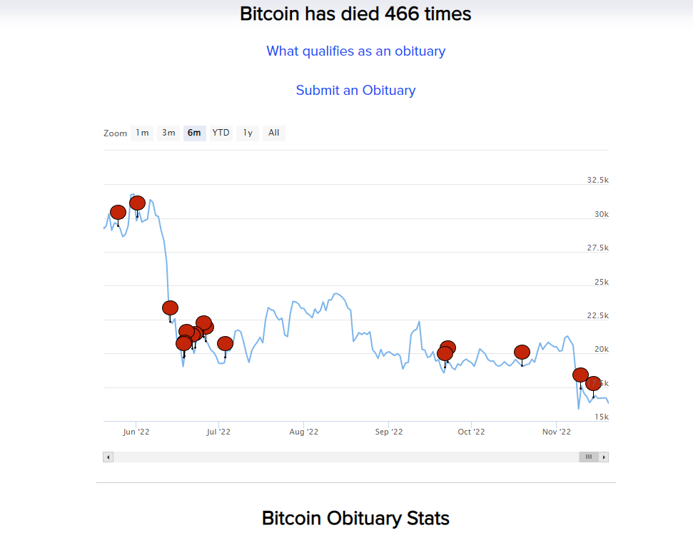 A morte do Bitcoin já foi decretada tantas vezes que foi criado um “obituário” para registrar o total de vezes que o ativo digital foi considerado extinto. Apenas em 2022 foram registrados 26 obituários para o BTC, mais do que os anos de 2010, 2011, 2012, 2013 e 2020 somando o total de 466 vezes que o principal ativo digital foi considerado morto.