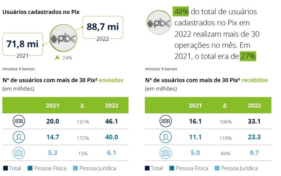 De acordo com Rodrigo Mulinari, diretor do Comitê de Inovação e Tecnologia da Febraban, o Pix registrou crescimento expressivo no número de usuários que realizam no mínimo 30 transações instantâneas por mês, os chamados heavy users, tanto para contas pessoa física quanto para pessoas jurídicas. Para envios de Pix, o aumento foi de 131%. Portanto, totalizando 46 milhões de heavy users, enquanto os recebimentos alcançaram 33 milhões de heavy users, alta de 106%.