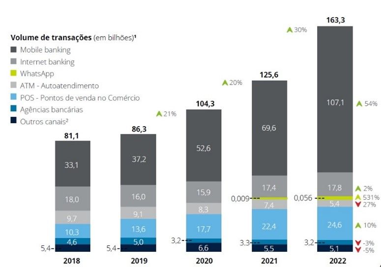 No total, os brasileiros fizeram, no ano passado, 163,3 bilhões de transações nos vários canais de atendimento disponibilizados pelos bancos, representando um significativo aumento de 30% ante 2021.