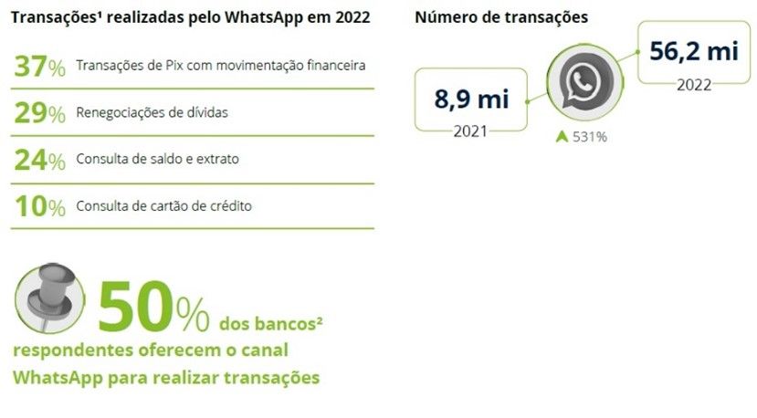 A pesquisa traz pela primeira vez dados de transações bancárias feitas via pagamentos pelo WhatsApp, liberado pelo Banco Central em março de 2021. Segundo o estudo, 50% dos bancos respondentes oferecem o canal WhatsApp para transações. Em um ano, as operações cresceram 531%, atingindo o total de 56,2 milhões de transações.