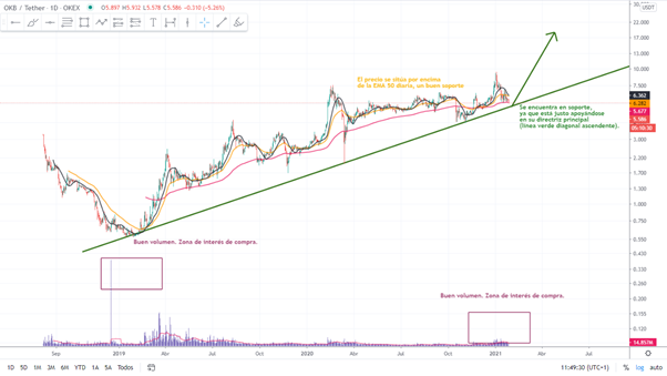 Se lermos os comentários do gráfico abaixo, na paridade USDT (Tether), podemos ver que o OKB tem, por probabilidades matemáticas e estrutura do gráfico, as chances muito altas de iniciar uma sequência de alta. O volume está nos deixando um sinal de que, pelo preço atual, há grande interesse de compra.