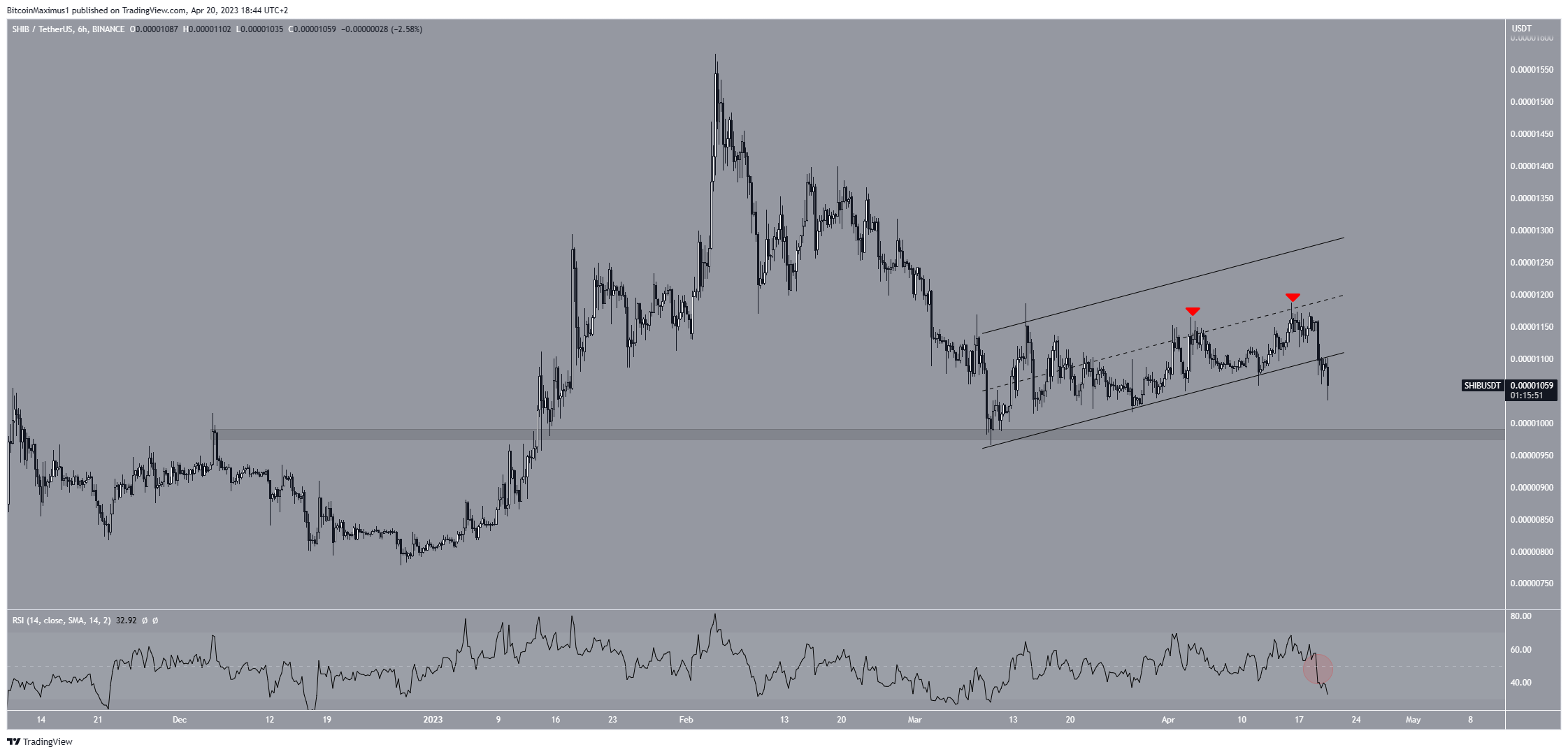Segundo nossa equipe de análises, o padrão de longo prazo da Shiba Inu (SHIB) ainda está intacto, mas o preço caiu em relação ao de curto prazo. A memecoin tenta agora encontrar suporte, com seu preço estando dentro de um triângulo simétrico.