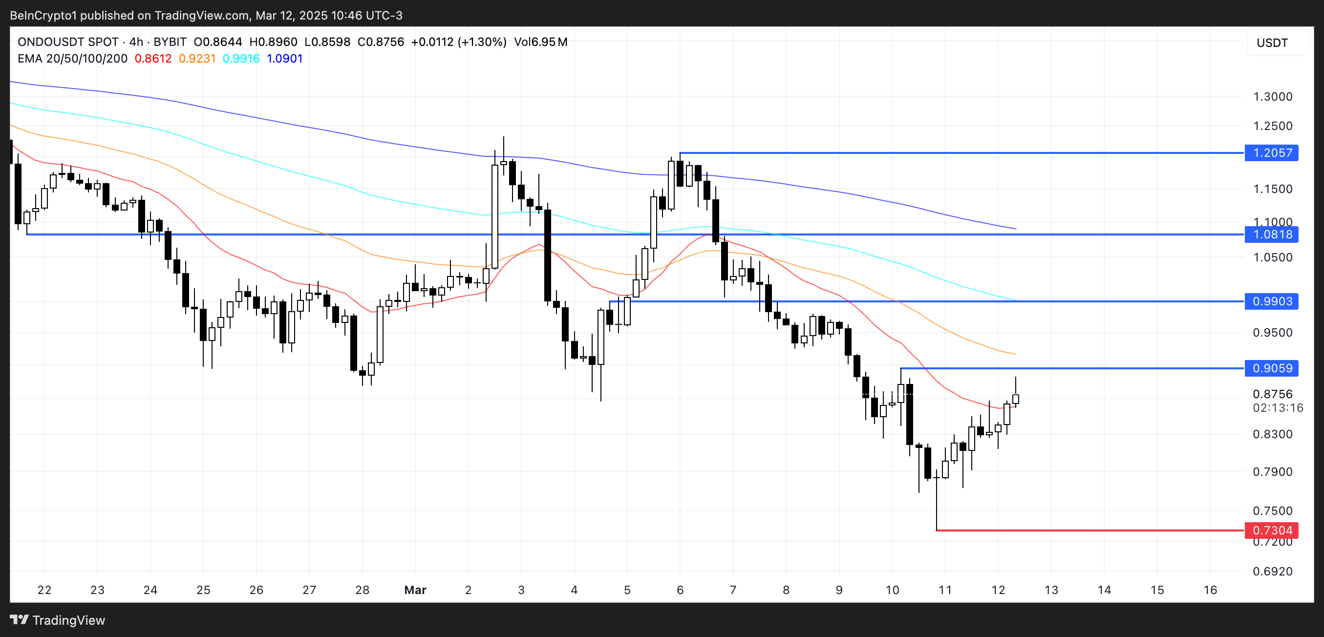 No entanto, se a tendência de alta falhar e a pressão de venda retornar, o preço da ONDO pode cair para US$ 0,73, com o risco de cair abaixo de US$ 0,70 pela primeira vez desde novembro de 2024.