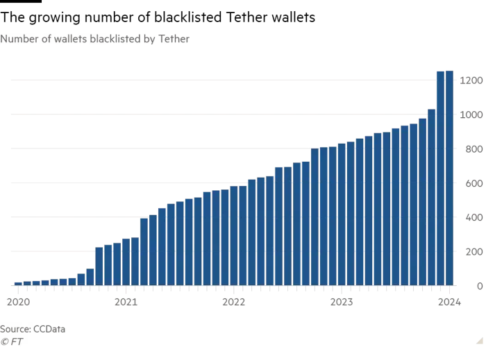 Número de carteiras Tether na lista negra por ano. Fonte: CCData/FT