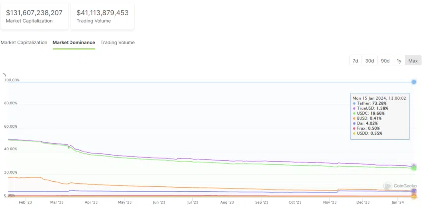 Apesar de enfrentar desafios e escrutínio regulatório, o domínio do mercado da Tether permanece inabalável. Ele ofusca significativamente seu concorrente mais próximo, a stablecoin USDC da Circle, que possui um valor de mercado de US$ 25,5 bilhões.