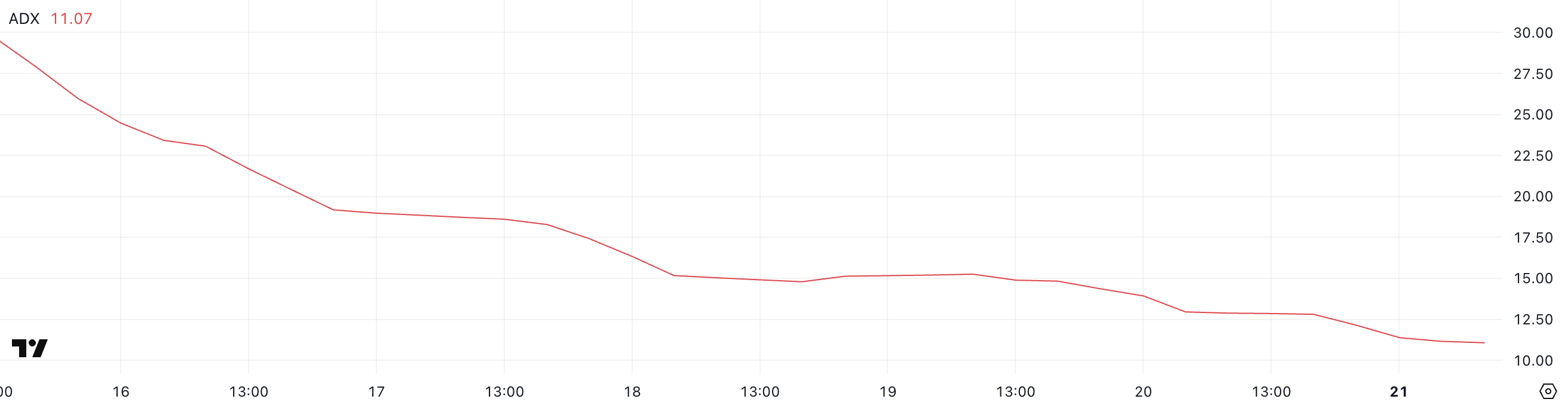 O Índice Direcional Médio (ADX) da onyxcoin caiu para 11, de 13,92 ontem e 15,26 dois dias atrás. Esta queda reflete um enfraquecimento consistente na força da tendência.