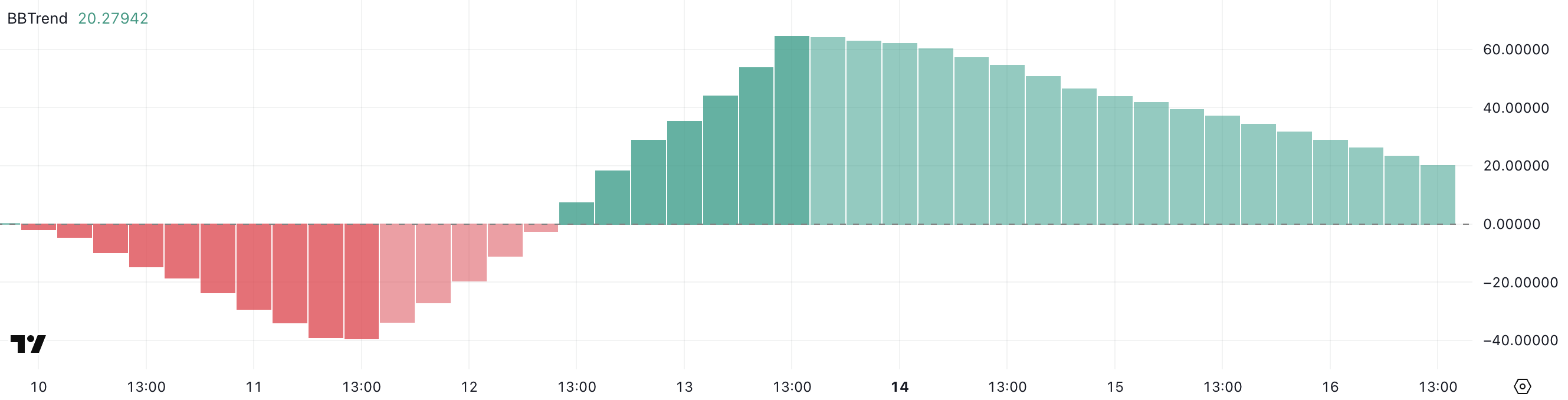 O BBTrend da moeda caiu drasticamente de 64 para 20,27 em três dias. O Bollinger Band Trend, é um indicador técnico que mede a força de uma tendência com base na largura e expansão das Bandas de Bollinger.
