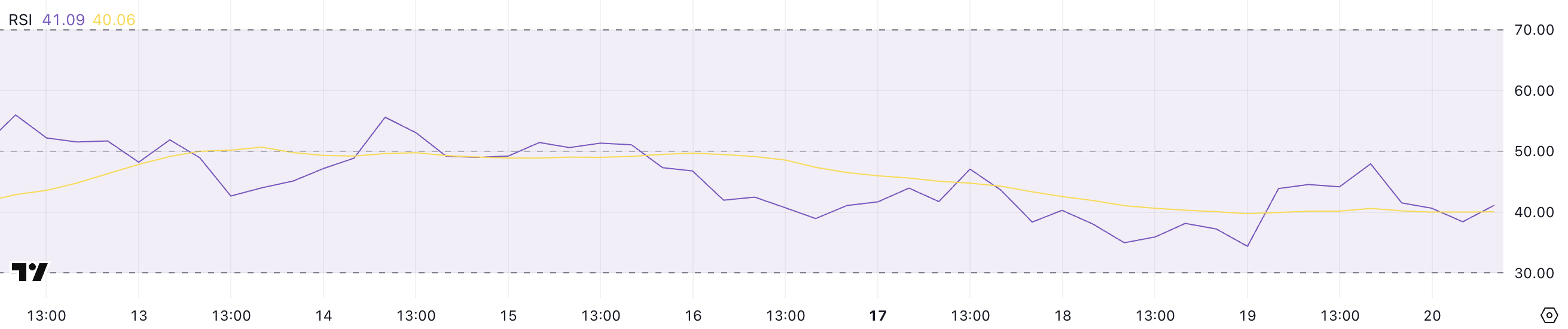O RSI (Índice de Força Relativa) da Onyxcoin está atualmente em 41,09, marcando uma queda em relação ao nível de 47,95 registrado anteriormente. Essa redução indica que o ímpeto de baixa ganhou força nas últimas 24 horas, afastando o índice da marca neutra de 50.