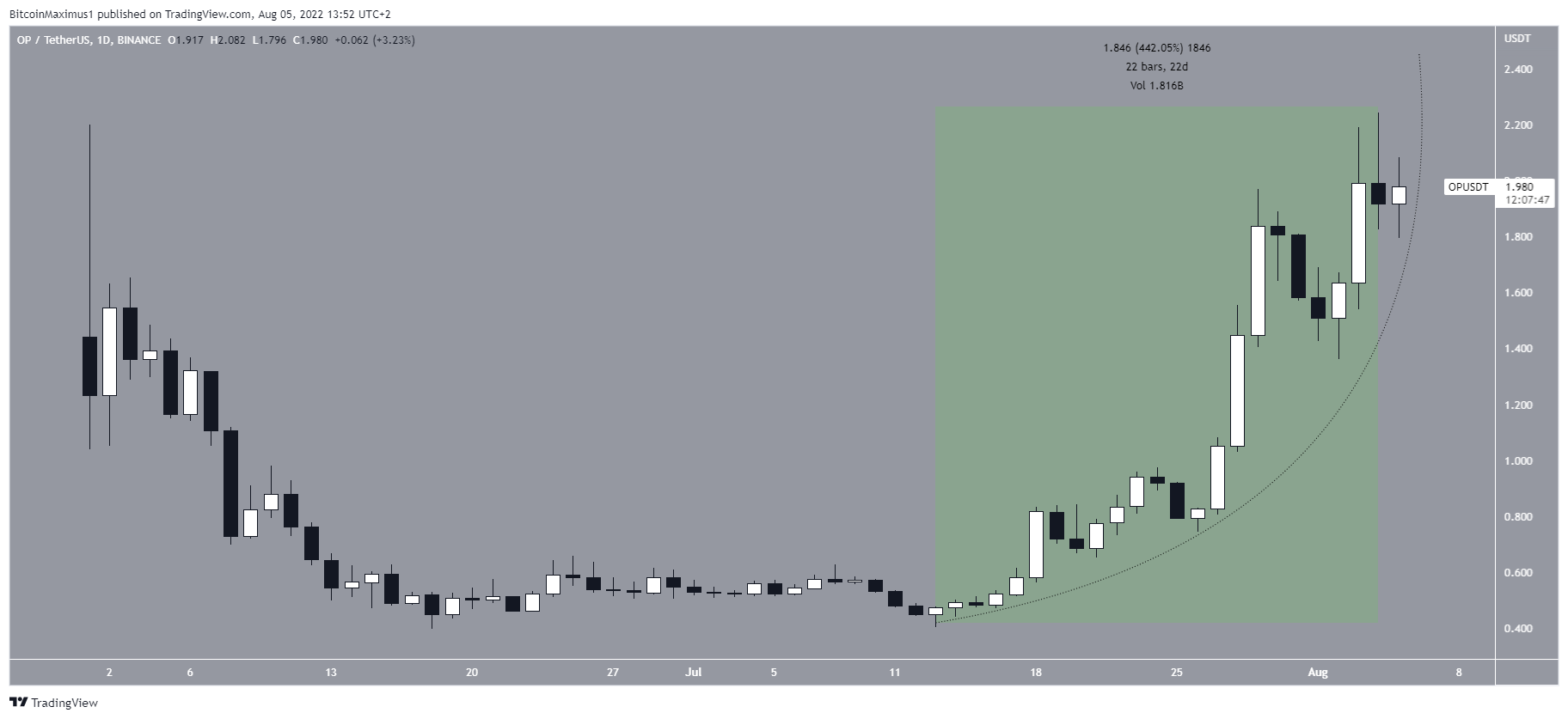 OP vem crescendo ao lado de uma linha de suporte parabólica ascendente desde 13 de julho. Em um período de 22 dias, o preço subiu 440%. Isso levou a um novo preço recorde de US$ 2,25 em 4 de agosto.