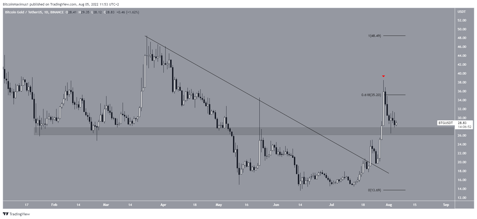Embora o preço tenha diminuído um pouco desde então, a linha de suporte parabólica ainda está intacta, assim como a tendência de alta.
