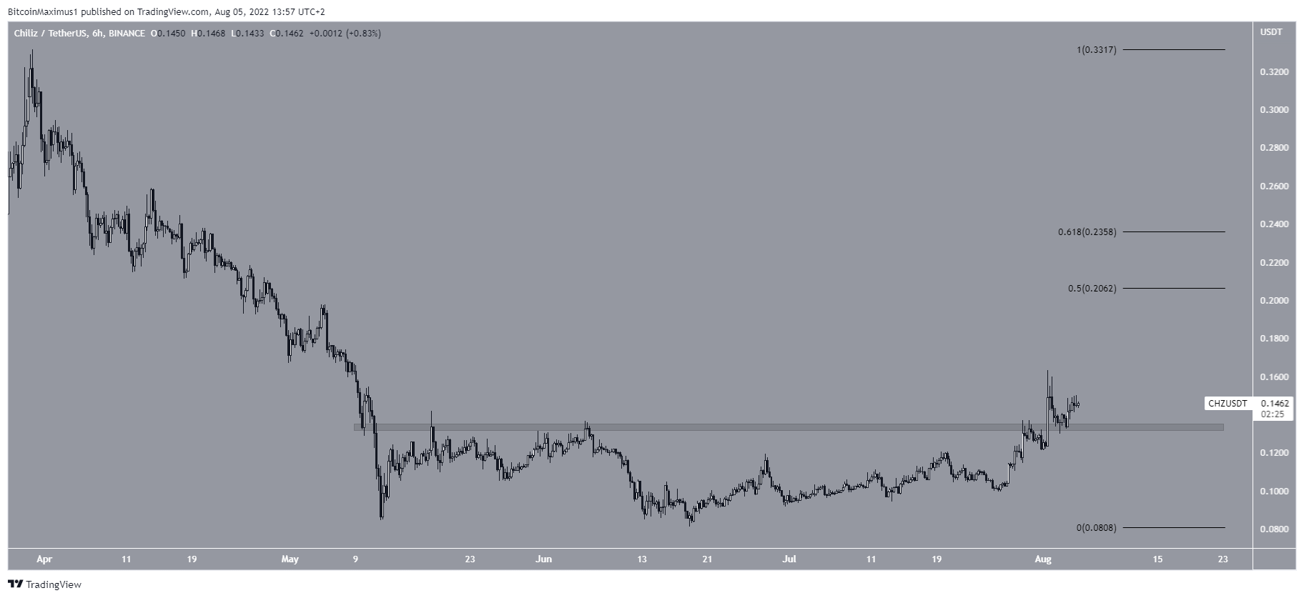 O CHZ está em um movimento de alta desde 18 de junho. Em 1º de agosto, saiu da área de resistência horizontal de US$ 0,134 e o validou como suporte no dia seguinte.