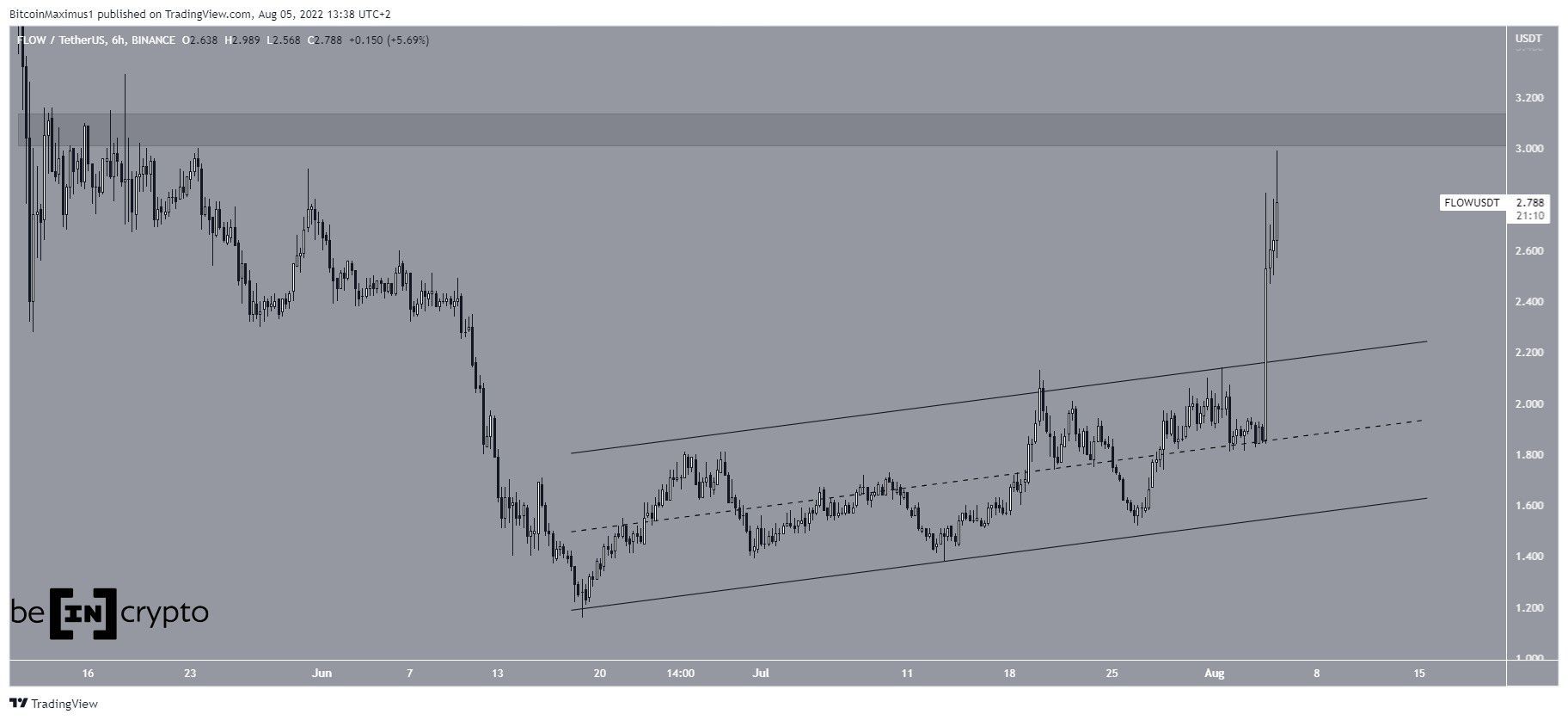 O FLOW estava subindo dentro de um canal paralelo ascendente desde 18 de junho. E conseguiu sair dele em 4 de agosto e atingiu uma alta de US$ 2,98 no dia seguinte.